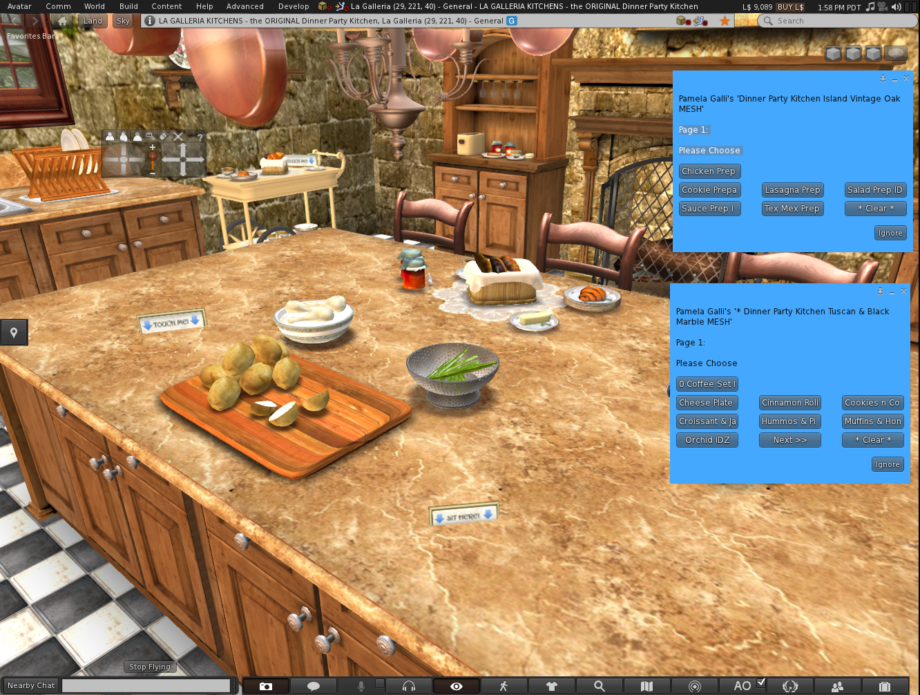 4. To lean against the island and chat with the cook, R Click and “sit” on the right corner of the island nearest doors .
